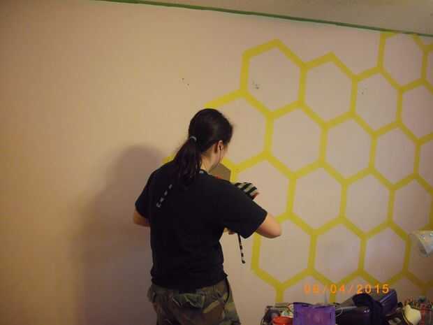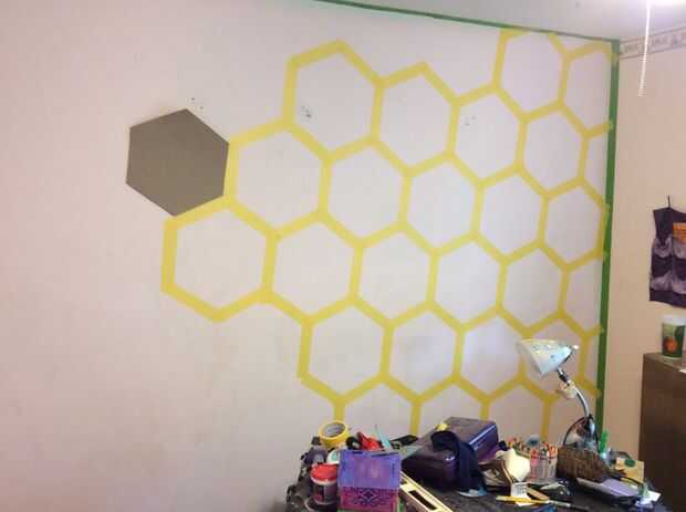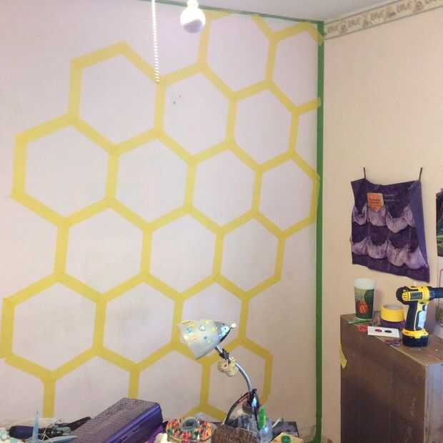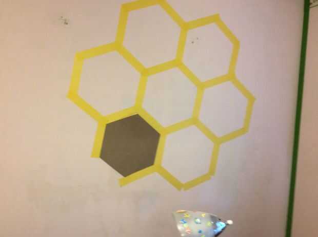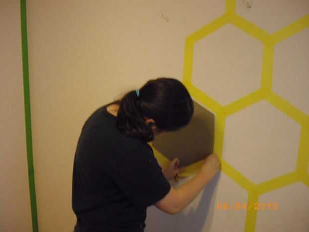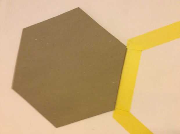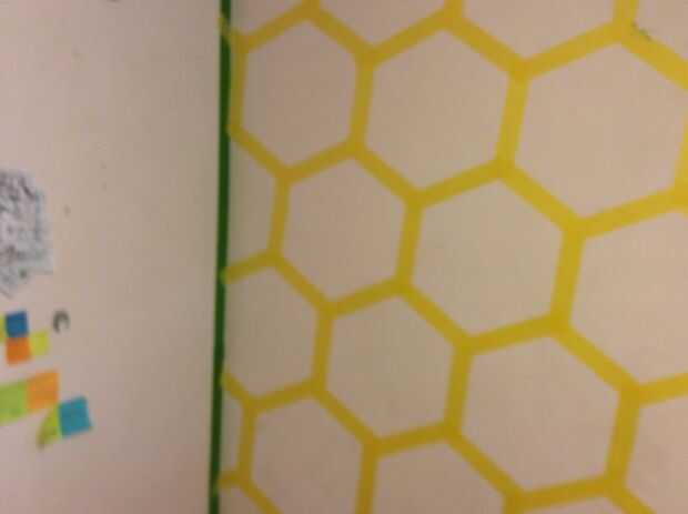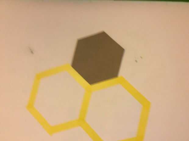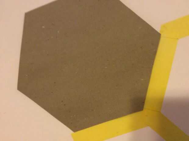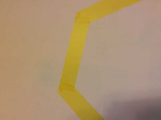 Utilizar la regla y el lápiz para marcar una línea perpendicular en el interior borde de la cinta de pintores. desea que la línea que en el interior de la esquina del hexágono. Ello en tanto dentro de las esquinas del mismo lado. Después de esto hecho línea de la plantilla hacia arriba para que las esquinas se alinean con las líneas que marcaste en la cinta. Cinta alrededor del hexágono.