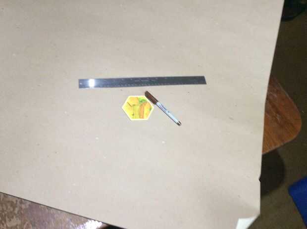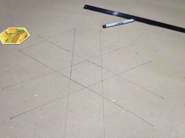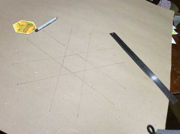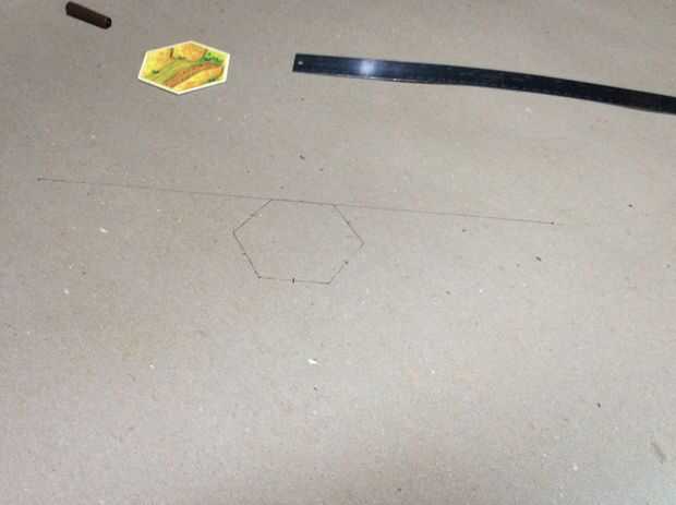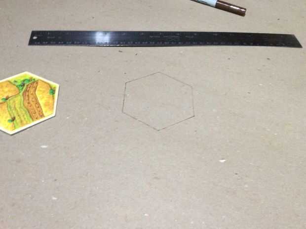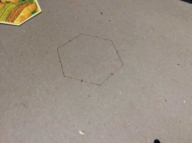 Usé un pedazo grande de cartón delgado para hacer mi plantilla. Una de las piezas del hexágono de lo colonos de Catan juego hacia fuera trazada sobre la cartulina aproximadamente 12 pulgadas de los bordes de dos.