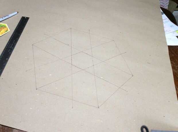 Luego tomó la regla y mide la longitud del lado dividido por la mitad y marcó. Luego tomó la regla y trazó una línea Rect 15 pulgadas de largo con 7.5 pulgadas marca en la marca del lado. lo hice en los seis lados.