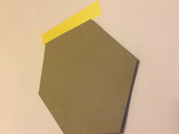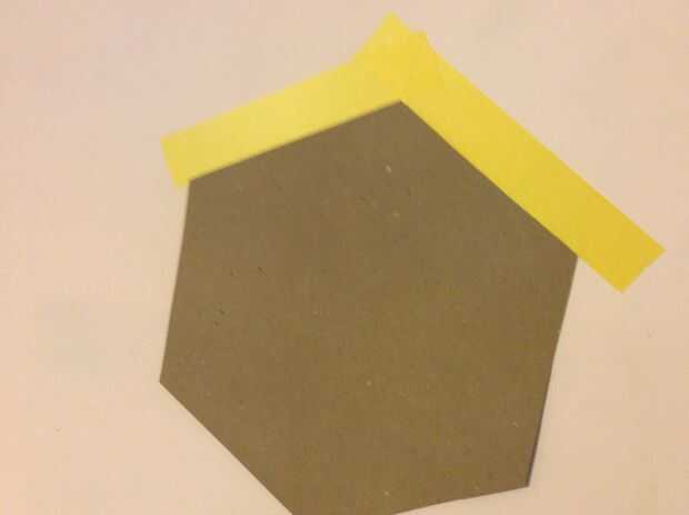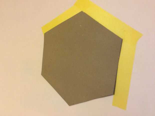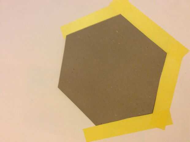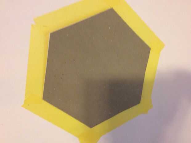 El hexágono a la pared con cinta adhesiva. Lo hice encima de un trozo de cinta y ponerla en la parte posterior. II comenzó con cinta de pintor y después continuamente adhirió poco me cambié a un par de trozos de cinta adhesiva en la parte posterior. La cinta del conducto no hicieron daño a la pared