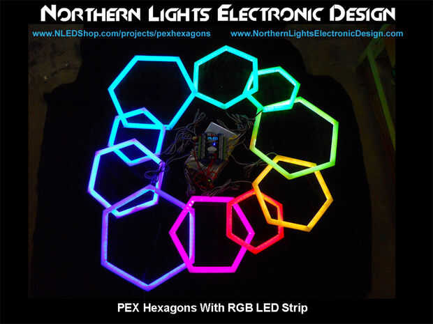 Construido para un telón de fondo de etapa este proyecto cuenta con algunas formas hexagonales de 3/4" la pipa de PEX, similar a un aro del LED hula, algunos 12 voltios RGB LED tira y un NLED 30 canal alto LED controlador de corriente. Los hexágonos PEX son casi perfecta buscando usando una técnica simple que implica U prensado en forma de clavos/grapas de esgrima.