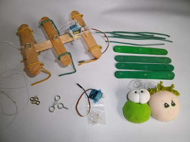 Este robot se hace con un cuerpo de cartón, dos micro servos para piernas, un servo estándar para el cuello, un Arduino Uno para el control, las secciones de poste de carbono pesca para las piernas y una espátula de madera para los pies y el cuello.F