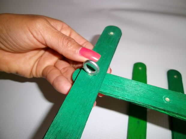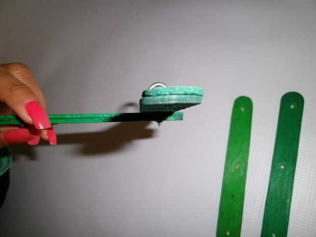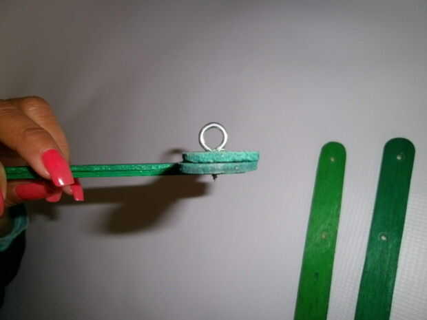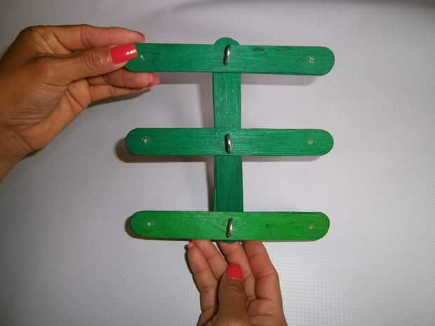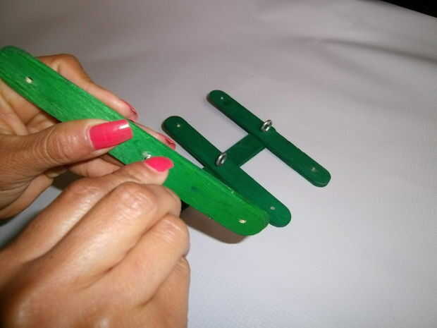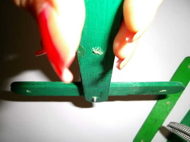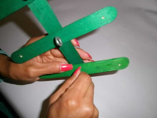 Coloque tres palos perpendiculares a la barra central de manera formen un 6 piernas.