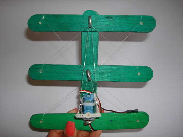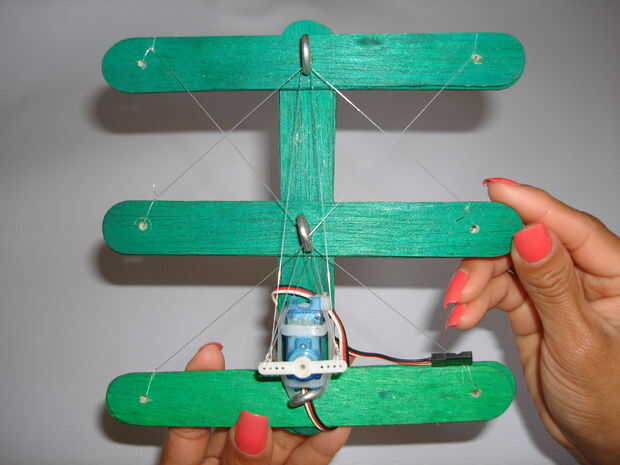 Este robot se hace con un cuerpo de cartón, dos micro servos para piernas, un servo estándar para el cuello, un Arduino Uno para el control, las secciones de poste de carbono pesca para las piernas y una espátula de madera para los pies y el cuello.F