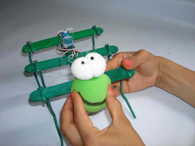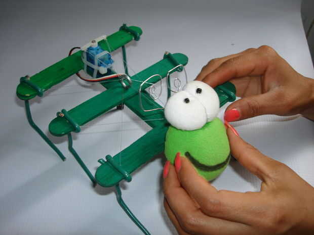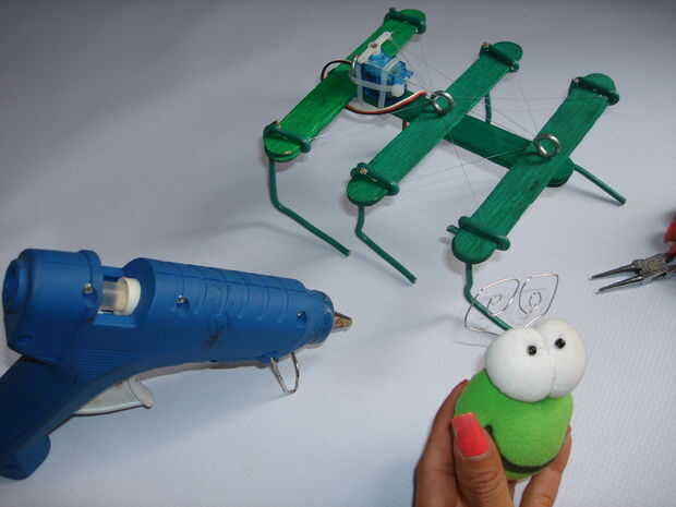 Este robot se hace con un cuerpo de cartón, dos micro servos para piernas, un servo estándar para el cuello, un Arduino Uno para el control, las secciones de poste de carbono pesca para las piernas y una espátula de madera para los pies y el cuello.F