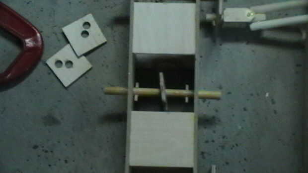 Ahora cortar cuatro trozos de madera que son 3.5" de largo y pegar en como se muestra, después de colocar los árboles. Estos se espaciar el chasis.