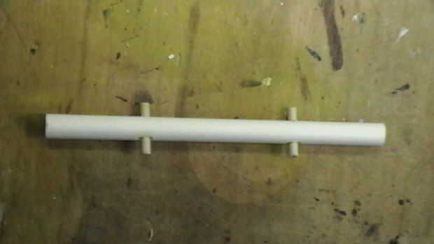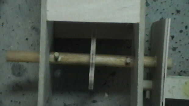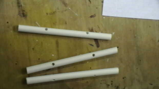 Ahora cortar tres 7" largo 1/2" tacos y del pedacito de taladro con la 3/8" 2" desde cada extremo. Corte 6 más 1" pedazos de la espiga de 3/16". Pegar los piñones (no pegamento) y pegamento en los pequeños tacos en los orificios de la espiga más grande. Estas dos pequeñas clavijas mantendrá el axel de desalojamiento o enganche en la parte posterior del módulo de la pierna.