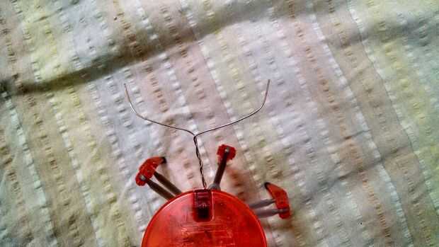 Ahora girar a la propagación de dos hilos en 180°, los dos extremos con longitud de 2cm a 90° con una leve curva en el ángulo, hacer un arma diferente y adjuntar a la segunda araña y tu propia mini battlebot par está listo.