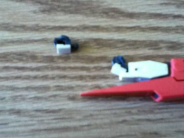 Esta es la única parte de partsforming involucrado (con la excepción de la arma y el escudo). Retire las manos y gire la muñeca piezas 90 º hacia atrás; el saliente que cubre el dorso de la mano debe estar en el mismo lado que la gran hélice rojo. A continuación, colocar el puño cerrado en el brazo. Hacer esto para ambos lados.