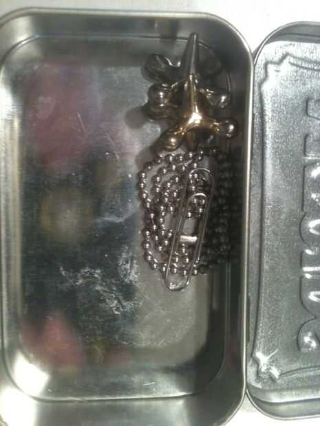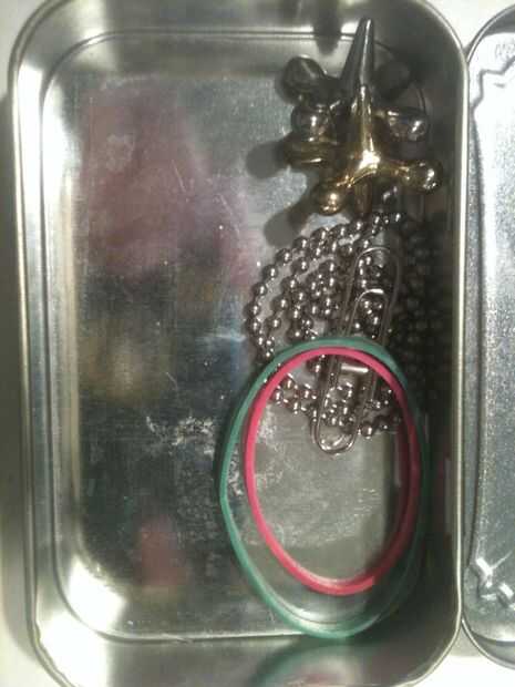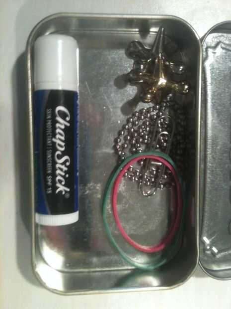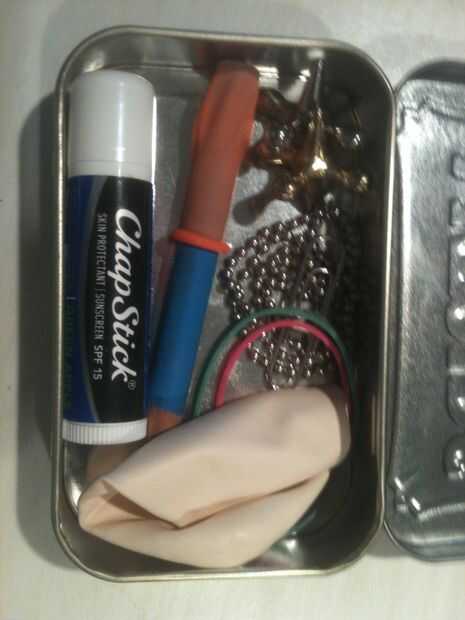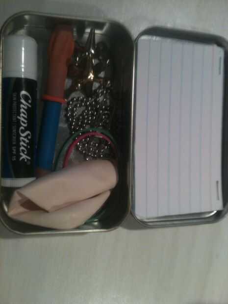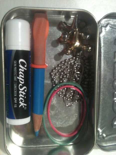 1: las tomas 2: el collar de cadena 3: clip 4: las 2 gomas 5: Chapstick 6: el lápiz 7: el globo 8: y el Bloc de notas