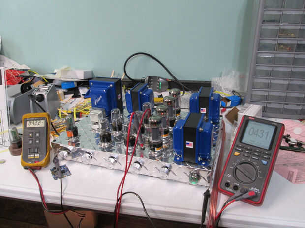 Ahora estamos listos, casi, para añadir energía. Proceder y añadir los tubos, seguir adelante y enchufe para sus respectivas cavidades. La primera vez puede ser un poco rígida, 6L6GC en cada salida zócalo del tubo, un 6SN7GT para el conductor y otro para la fase partida y pre amplificador del tubo.