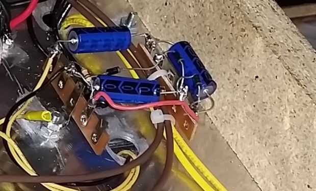 Paso 3: Conecte el circuito a los 12,6 voltios cables de salida del transformador pequeño y potencia el transformador pequeño con corriente doméstica de 115 a 120 v y verificar que el multiplicador de voltaje está produciendo 51 o más voltios. No se alarme si la descarga es un poco más alto, cuando carga encima de él caerá en línea.