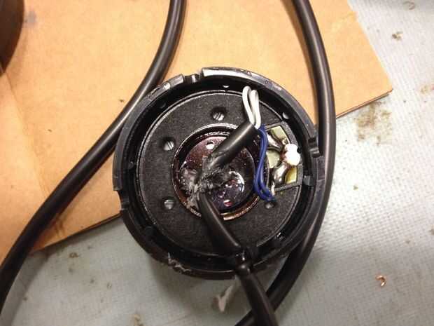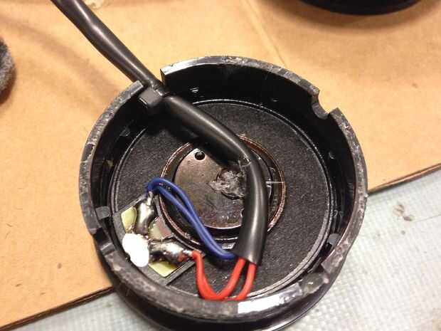 1) desenganche las latas de la diadema y quite las almohadillas. Esto es fácil, ya que las latas solo a montar los dos pernos. Tirando del yugo aparte, pueden salir los pernos en sus agujeros y separar las latas de la diadema. Asegúrese de marcar la izquierda y derecha puede antes de hacer esto ya que no hay manchas en ellos, y marca el punto donde las dos mitades de satisfacer así podemos reagruparlas correctamente.