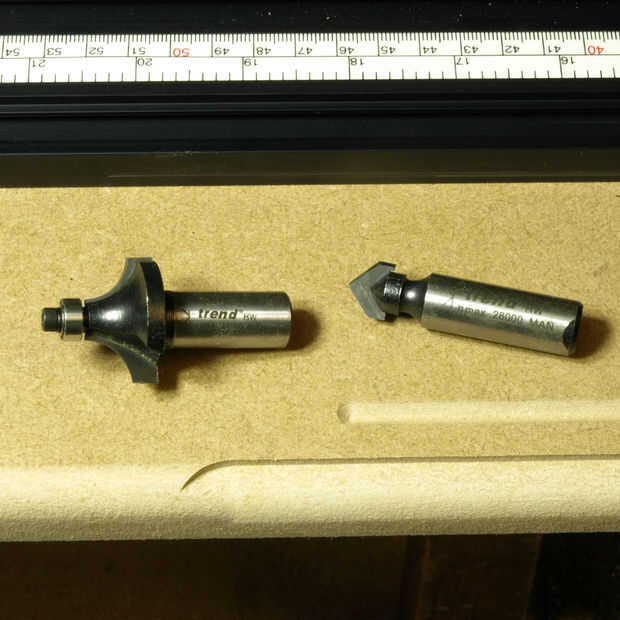 En un borde largo del MDF, cree el perfil que desea mostrar en la parte superior de la placa base.