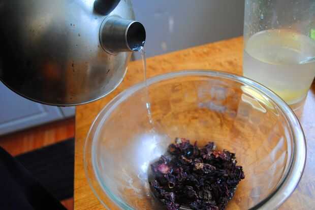 Una vez que el agua comience a hervir puede poner las flores en un recipiente de vidrio y verter el agua caliente sobre ellos. Que fuerte para un buen 10 minutos hasta que el agua tiene un color rojo oscuro.