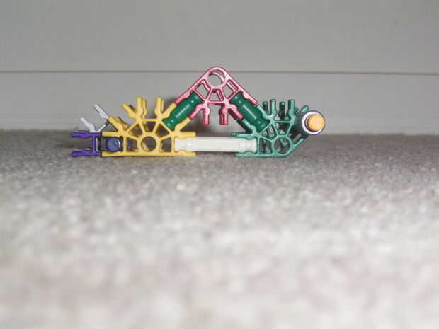 Esta bisagra encaja en las 2 partes adicionales del paso anterior. Esto conecta la bisagra de peso de contador y la bisagra de brazo.