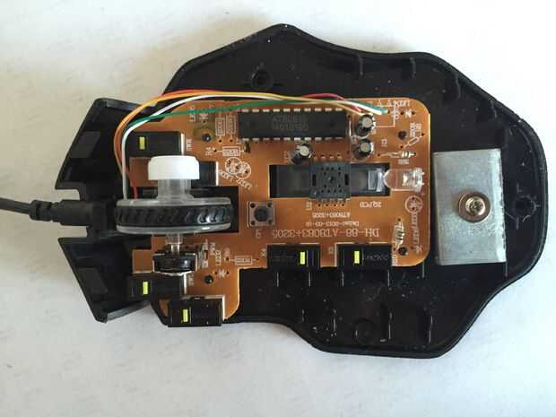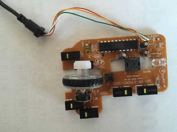 En este paso es necesario abrir el ratón y el centro para acceder a los cables. Desenroscar los tornillos y recordar cómo se ensambla el ratón. Tomar fotos si es necesario. Ya quité el plástico de una de las salidas del centro.