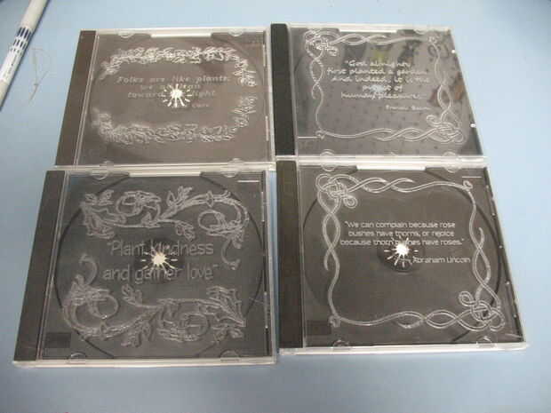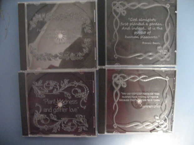 Usando un programa como Adobe Illustrator o Corel Draw, diversos diseños de montaje 1-4 a ser grabadas en las tapas de sus casos de joya. Para hacer las cosas fácil un cuadrado de 4.75" puede servir como su área de tablero de arte. (Tamaño real es 4.75" de ancho por alto de 4,715" para ser exactos). Elegí planta orientados citas junto con planta / fronteras de tipo de vid.