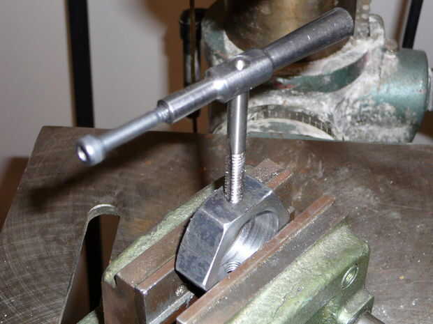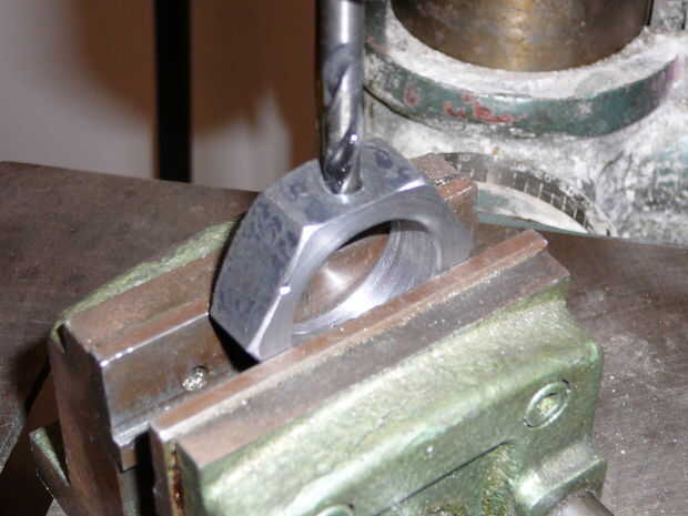En un lado del perno, en el centro del taladro y toque la rosca de perno más largo a través de una pared. Luego en el lado opuesto del taladro y toque el tamaño más pequeño de la rosca del perno a través de una pared en el centro.