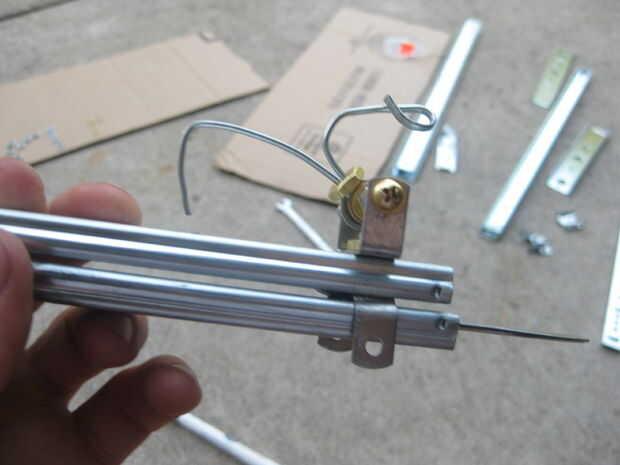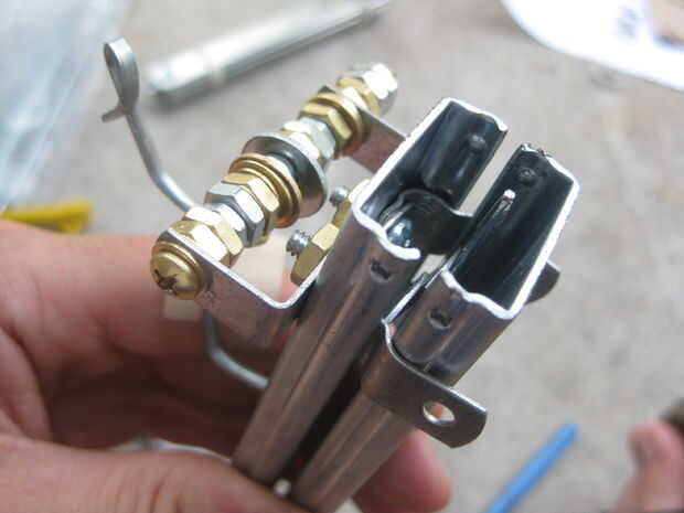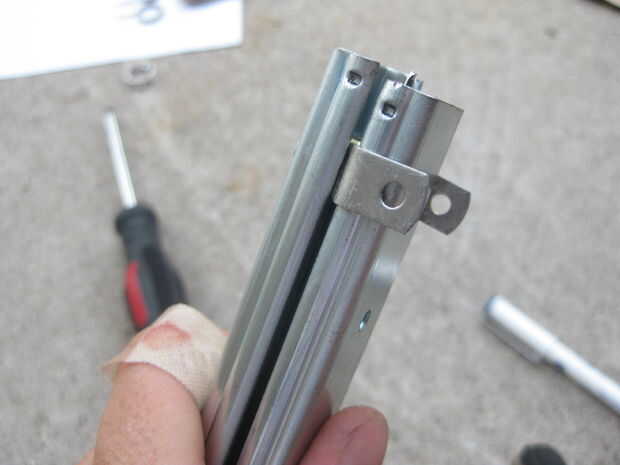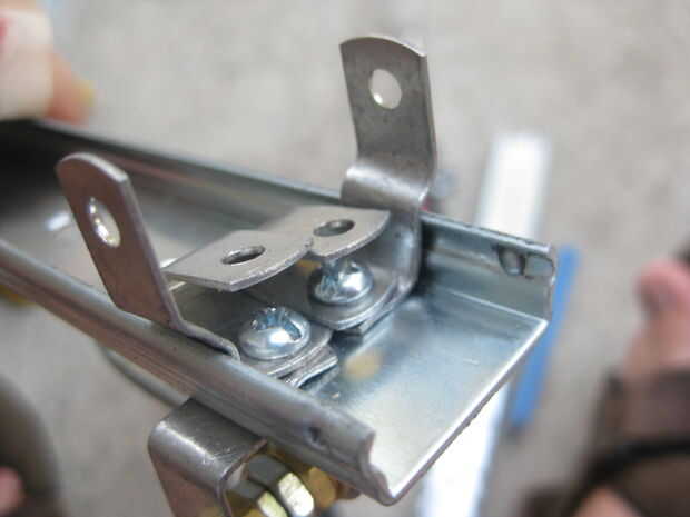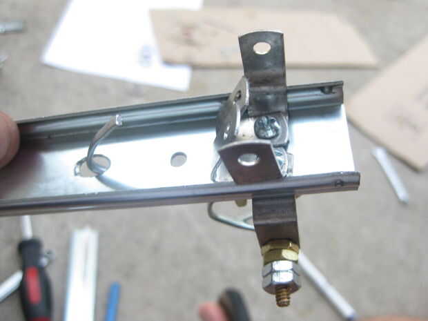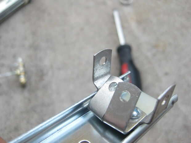 La "clave" en su lugar y mantenga el paso anterior junto con este paso en lugar demasiado mientras cuidadosamente empuje un pequeño tornillo a través de los agujeros (a través de agujeros de soporte de la llave) y coloque una tuerca del lado de la tecla. Apriete firmemente como se pueda. Luego doblar y apretar el soporte en L en la parte inferior sobre la cabeza del perno. (Imagen 4)