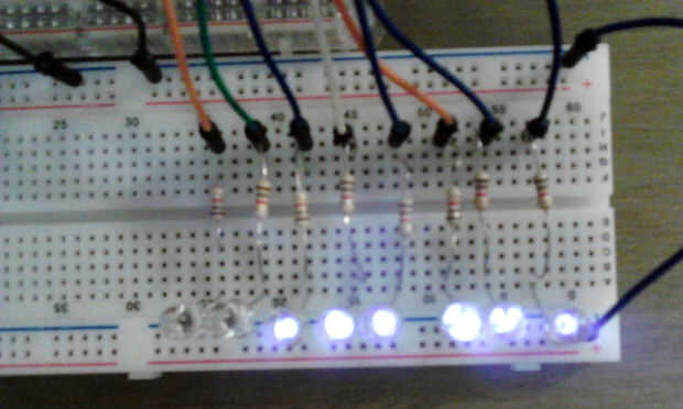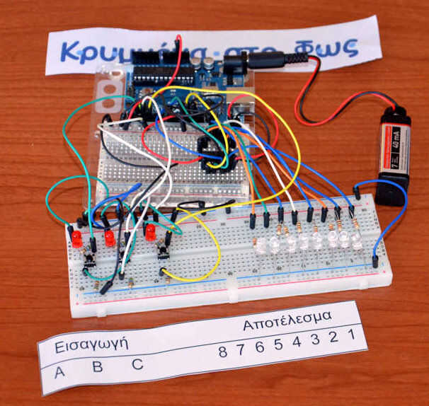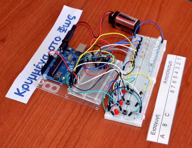 Hay 8 leds de IR por un registro de desplazamiento 74HC595. Empujando uno de los botones A o B o C el arduino envía un número para el registro de desplazamiento que se traduce en binario y enciende los leds de IR correspondientes. Los estudiantes ven pulsando los botones que se iluminan los leds rojos cerca de los botones pero por supuesto que no pueden ver la luz de la ir