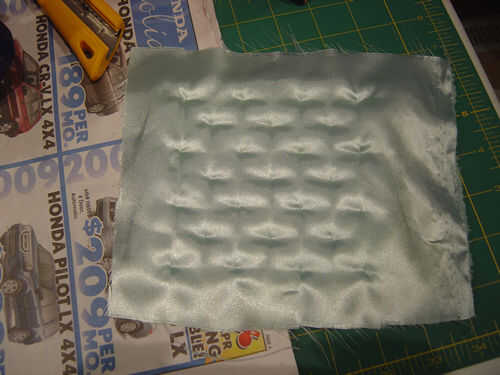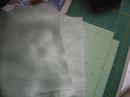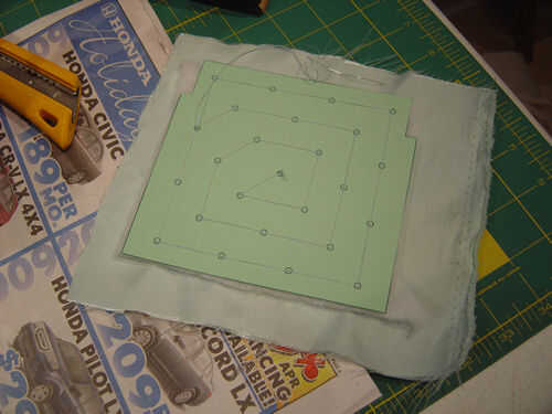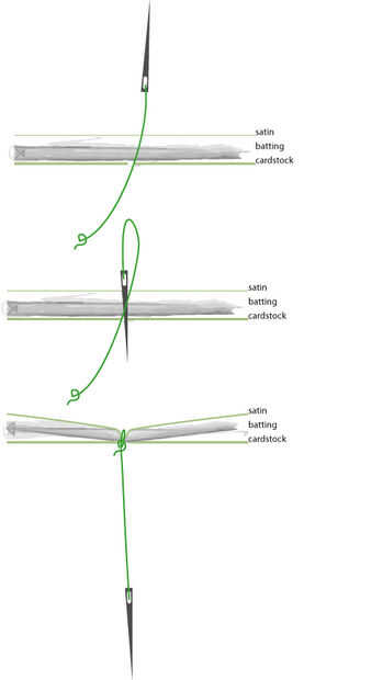 Pila de bateo en la cima de la cartulina, el satén. Desde el centro. Coser a través del orificio que había perforada, a través de todas las capas, entonces detrás abajo a través de las capas y el agujero, dejando un punto muy pequeño en el lado satinado. Tire de ella hasta dejar una depresión en el lado satinado. Puntada para arriba a través de un orificio cercano y repetir. I espiral del centro hacia afuera para mantener a la tela incluso y liso. Amarra el hilo al final (o parcialmente a través de if se ejecuta hacia fuera. Sólo volver a pasar y seguir adelante.)