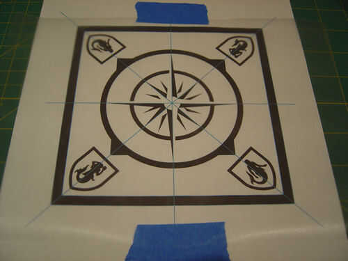 Retirar el respaldo. Cinta adhesiva lado pegajoso hacia arriba en la parte superior del patrón.