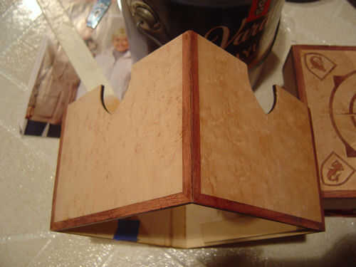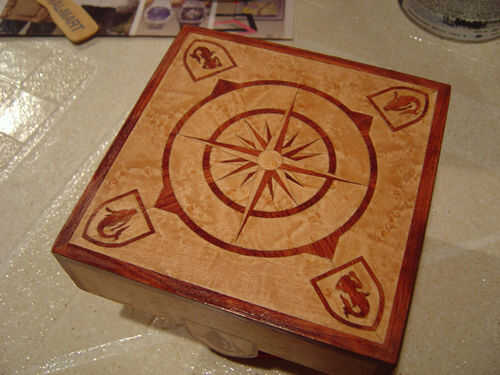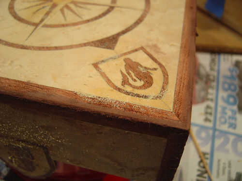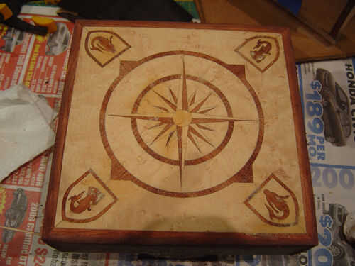 Cuando todas las carillas se pegan cuidadosamente retire el vinilo. Puede que necesite quitar algún adhesivo de la caja-utilice alcohol de frotamiento para. Rellene los huecos con la masilla para madera - oscuro en las zonas oscuras (como las esquinas), luz por todas partes otro. Deje que se seque muy bien, luego arena suave. Seguir las indicaciones de barnizar para aplicar acabado a todos los de la caja.