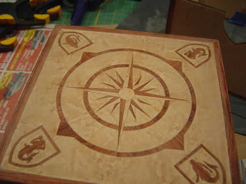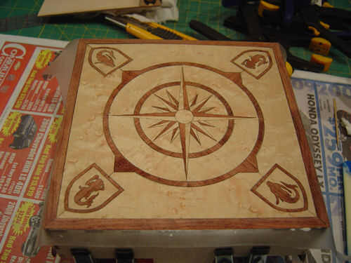 Coloque la pieza de chapa en la caja donde va ir pegada. Verifique la colocación, figura hacia fuera cómo usted lo desea, realizar ajustes en la chapa que usted necesita. usted necesitará colocarlo rápidamente cuando el pegamento está en la caja así que tómate tu tiempo ahora.