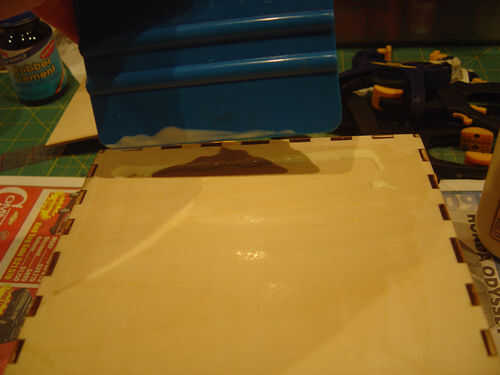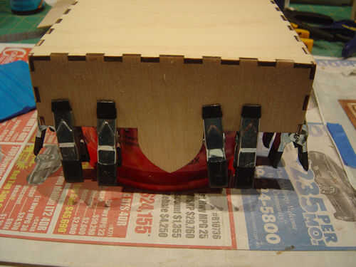Coloque la pieza de chapa en la caja. Ajustar si es necesario colocar exactamente. Poner una tabla de desecho sobre él y sujete firmemente en su lugar. Utilice abrazaderas como muchos como usted puede. Para la parte superior puse la tapa sobre una bobina de CD y libros pesados apiladas encima de la caja en lugar de porque no pude conseguir un buen ángulo para mi las abrazaderas de sujeción. Esto dio lugar a la textura un poco más que apenas de sujeción pero todavía lija suave.