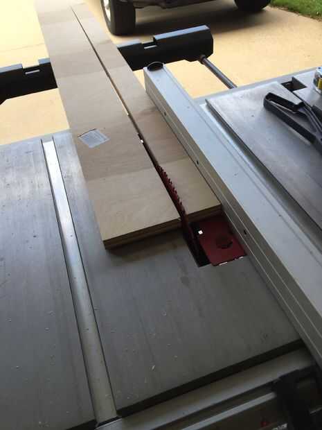 - Luego tomó el largo desecho de la madera contrachapada y arrancó en tres secciones, cada uno apenas tímidas de 2" de ancho. Usé una valla para esto por lo que las piezas serían tan idénticas como sea posible. Estos serán los lados de la superficie de la tabla que mantienen el cojín cambiante en su lugar.