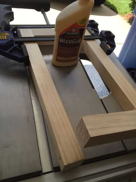 - Ahora para el marco. Con todo, es un rectángulo básico con una pieza extra en el medio. Así que corté todas las piezas del marco con una sierra de cortar, que ajuste en el gabinete, y luego pegados y atornillan utilizando tornillos de 2-1/2". Después de cortar las piezas de la base de la estructura, también corté a dos miembros de soporte de 2 x 2 para cada una de las alas - más de los que cuando nos juntar.