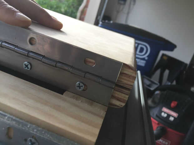 - Con la pieza media de la tabla (extra) firmemente fijada a la estructura, he añadido las bisagras de piano a cada lado de la la madera contrachapada con 1-1/4" tornillos para madera. No es de extrañar yo marcados y perforados agujeros para los tornillos. La parte posterior de las bisagras queden al ras con la parte trasera de la madera contrachapada y el marco.