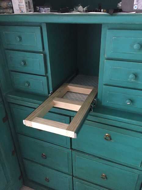 - Ya que el marco está ya juntos, necesitaba el interior de las correderas montado a él. Después de doblar un trozo de cartón, deslice en la cavidad de la caja y coloca el marco en la parte superior. Esto levantó el marco justo al lado de la superficie del gabinete y un poco sobre el borde de la diapositiva del cajón. He marcado donde la parte inferior de las diapositivas golpeó el marco de la tabla y utiliza Plaza de framer para seguir esa línea por el borde del marco.