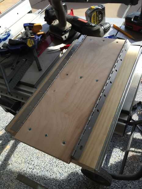 - Tuve un poco de dificultad con esta siguiente parte y probablemente hay una mejor manera de hacerlo, pero al añadir las alas de la tabla, una ala la vuelta 180 grados alrededor de la bisagra, alineados los bordes de la madera contrachapada, marcado y taladrar agujeros piloto y agregó tornillos. Luego dobla eso ala salida a su posición de reposo y había atado al otro lado de la misma manera.