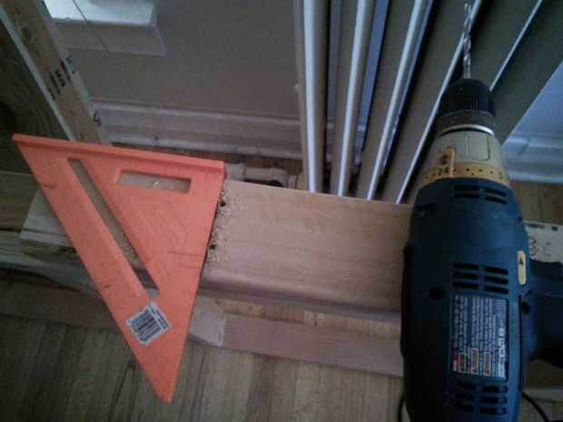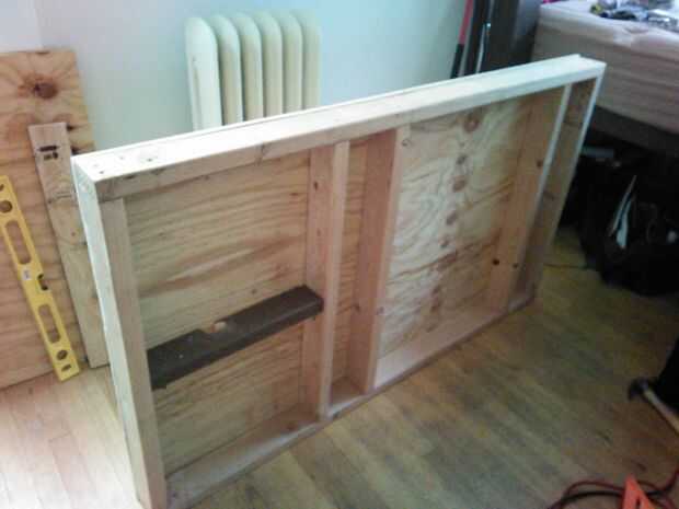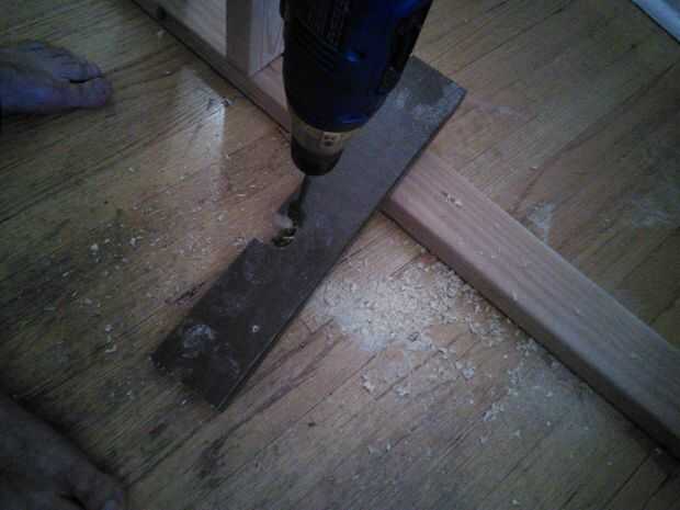 • Estantes sólidos: utilicé madera cortar para caber para hacer los estantes. La pieza marrón que se muestra en las fotos es chatarra cortar para caber y con agujeros perforados para poder cables. Más tarde decidió poner al monitor en el primer estante y perforó un segundo conjunto de agujeros a través del marco.