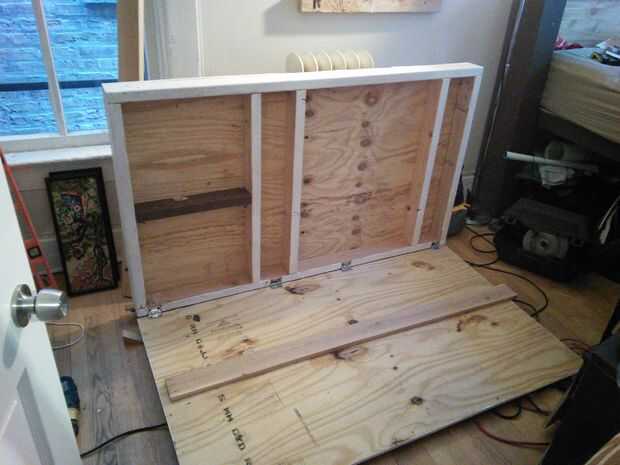 3. línea de junta con las bisagras y utilizar una madera de 2 x 4 y chatarra como sea necesario para permitir que la Junta en 90 grados a la estructura