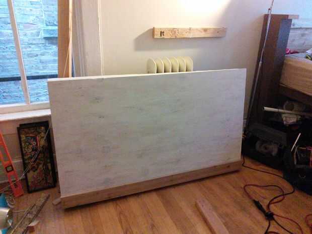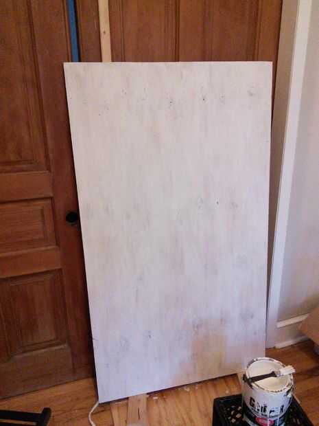 Pinté la parte posterior de la madera contrachapada. Si se trata de una nueva hoja de madera contrachapada de 1/2" no pintar la parte de atrás ya que podría deformar mientras se seca. Con 5/8" o más que no debería ser un problema.