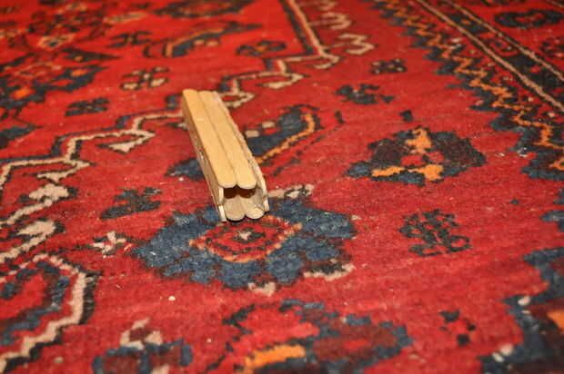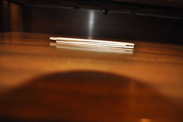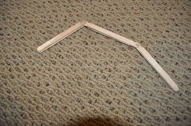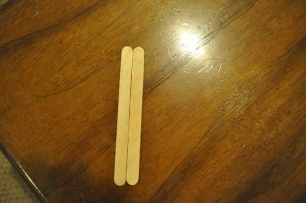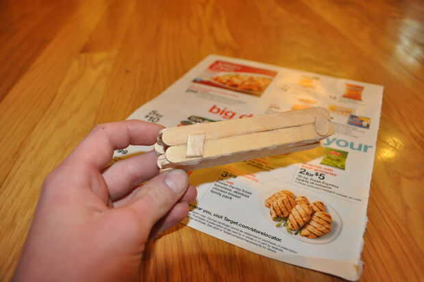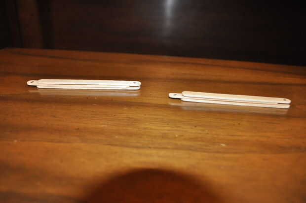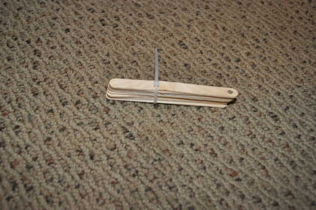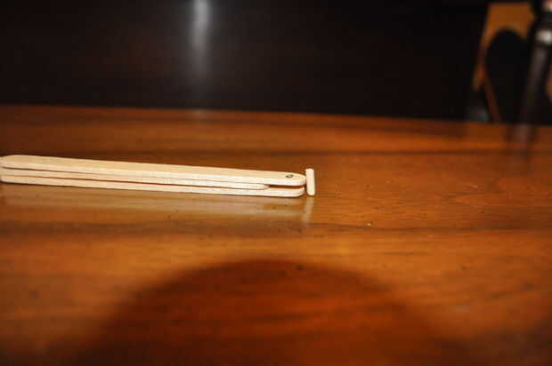 3. pila 3 de los palitos perforados y empuje el centro hacia fuera en más allá de los otros 2. Utilizando otro grupo de palitos alineados como esta, línea lo para arriba con el agujero de los 2 palitos o una que está pegando hacia fuera. Usando el lado cortadores, cortados un pedazo de pincho que cuando se coloca a través del orificio en el alineado a popsicle palos voluntad sólo sobresalgan un poco.