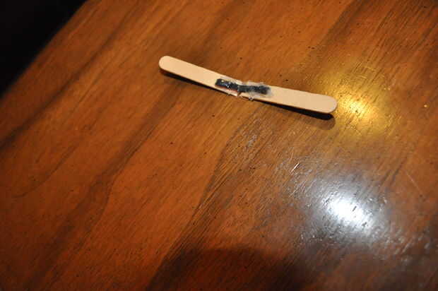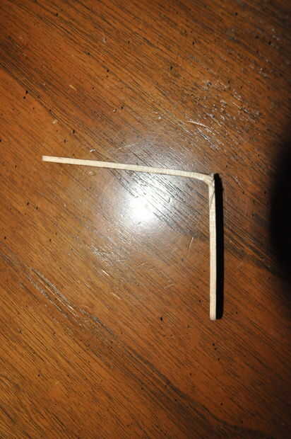 4. Pegue la pieza de una pulgada de palito en el interior de la quebrada palito y caliente, antes de que se haya enfriado, coloque la pieza de modo que esta sección de la pinza de forma aproximadamente un ángulo de 90 grados.
