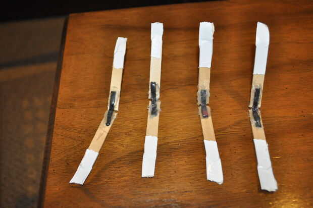 2. uso de cortadores, corta 4 trozos de palito (aproximadamente una pulgada) de un pedazo de chatarra de palito y enderezar los lados con los cortadores o incluso una lijadora de banda para llevar cualquier curvas.