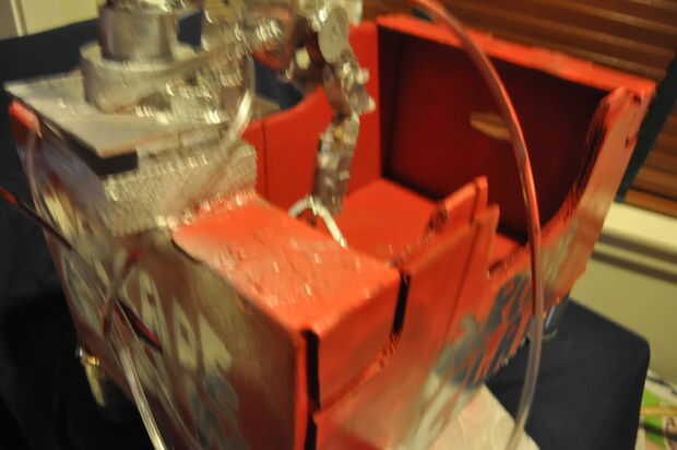 5. me ha pasado que tienen madera discos de mentira alrededor de los cuales he utilizado para este paso, pero puede perforar con una broca especial o utilizar 2 plazas para este paso. Encontrar o hacer 2 círculos de altura de una pulgada o plazas (a más de tres pulgadas en diámetro o anchura) y cortar un trozo de 2 pulgadas de espiga de 1/4 de pulgada de diámetro. Si no hay un agujero a través de sus círculos o cuadrados, perfore un agujero que se ajusta el tamaño del pasador que se utiliza. Utilice madera mitad de cola a cola del pedazo de taco que usas y pase por el agujero en uno de los círculos o cuadrados que tiene. Esperando la cola para madera secar, encuentre una caja grande (yo usé una caja de 12'' de altura, por 24" de largo, por 16" de ancho) y corte una pieza de madera de 1'' de espesor, por cerca de 3'' de ancho, por la anchura de su caja. Coloque la pieza de madera a lo ancho en el extremo de la caja y pegamento caliente allí, esto mantendrá la base que sostiene el brazo. Una vez suficientemente seco para trabajar con el pegamento para madera, caliente pegamento el brazo en el cuadrado o círculo con la espiga para que cuando termines, la espiga apunta hacia abajo, no hacia la jeringa. Ahora, pegamento caliente el cuadrado o círculo sin el taco pegado en él para el centro de la tabla usted pegado a la caja y pega la espiga en el otro círculo o un cuadrado en el agujero perforado en el sólo pegada. Pegamento caliente un cubo a un lado del primer segmento del brazo, asegurándose de que está por encima de la tabla, no de la caja. Varios cubos de hielo en el tablón que el brazo está conectado a la pila y luego colocar una jeringa en la parte superior, asegurándose de que la jeringa esté nivelada con el brazo de las garras de arcade. Pegamento caliente los cubos que apilan juntos y pegamento luego caliente un cubo perforado, redondeado en su émbolo de las jeringas. Coloque los cubos con la jeringa en la parte superior de modo que cuando el émbolo de la jeringa es completamente expulsado, es el brazo hacia un lado de la caja y cuando está completamente introducido en (fingir que el brazo está conectado al émbolo) que es el brazo hasta el otro lado; Esto puede tomar un poco tiempo asi que tengan paciencia. Cuando se colocan los cubos y el émbolo, la pila de cubos para el tablón del pegamento y luego pegue la jeringa a la parte superior de la pila de cubos. Por último, cable unir el cubo en el émbolo al cubo en el brazo.
