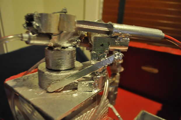 1. la primera jeringuilla del puesto es el más difícil, es el que levanta todo el peso del brazo (que por garra de arcade #1 era un problema porque era demasiado pesado). Usando cinta, coloque la jeringa en el primer segmento de su brazo. El cubo redondeado en el émbolo de la jeringa debe descansar en el segundo segmento del brazo. Prueba su movimiento empujando el émbolo hacia adentro y hacia afuera, el brazo debe moverse hacia arriba y hacia abajo. Tenga en cuenta que no todas las jeringas pueden tener ser empujado completamente para obtener una gama completa del brazo hacia arriba y hacia abajo. A continuación, hilo de un cable ATA a través del orificio perforado en el cubo y a través del orificio en el prisma de paletas en el segmento del brazo que está trabajando en y apriételo lo suficiente eso él puede desplazar a lo largo del brazo un poco.