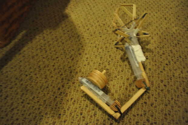 3. pegar un palito en el cuarto segmento del brazo de manera que sobresalga 1/2 una pulgada. A continuación, rasgar alrededor de una pulgada de cinta y doblarlo en la mitad lado pegajoso en. A continuación, pegar un lado de la cinta a un émbolo de una jeringa sin un cubo en ella y luego al otro lado de la cinta a la parte sobresaliente del palito a pegado al cuarto segmento del brazo. A continuación, enderece el brazo entero, poner pegamento caliente en la parte inferior de la jeringa que sólo estaba trabajando, entonces establece la jeringa en el brazo. Quiera la jeringa en el brazo en lugar de pegado de cinta aislante lo que usted puede cambiarlo si es necesario.