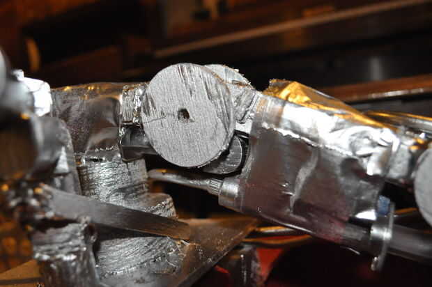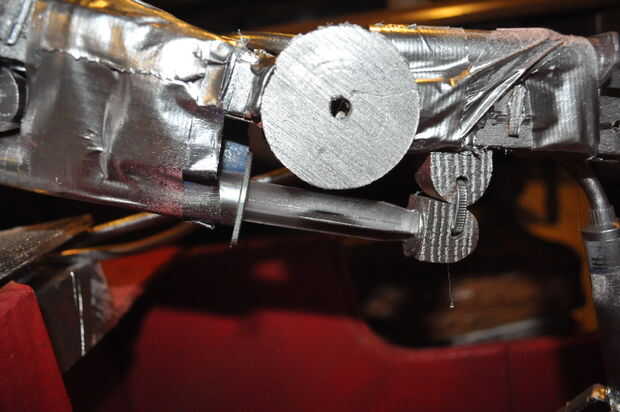 Corte tres 2'' diámetro chapeado fino círculos (acerca de 1/4 de pulgada delgado), un agujero. Pegamento caliente con cuidado los círculos junto a las articulaciones de bisagra para que el brazo no se tuerza cuando se mueve hacia arriba y hacia abajo. Esto hace más fácil para el sistema hidráulico funcione, de lo contrario, su brazo no tiene tan grande de una gama de movimiento.
