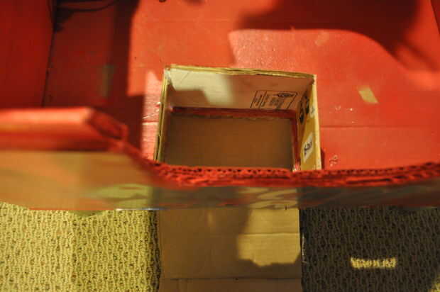 5. sólo para hacer menos complicada, que llamo al lado del corte un agujero cuadrado no tocar el lado de la caja las instrucciones (vea el cuadro) VIP lateral porque es especial y clave a los pasos 5 y 6. Cortar un cartón canal con un ancho igual que el lado VIP y una longitud de unos 10''. La longitud debe salir debajo de la caja con unos 3'' extra.