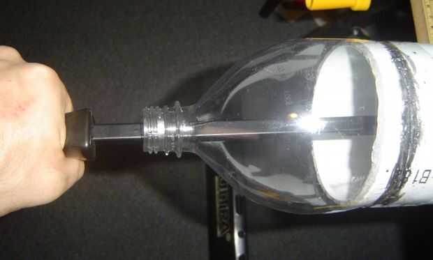 3. Inserte un eje largo en el tubo, a través del cuello de la botella, lo más lejos posible. Esto se utilizará para obtener la forma deseada mientras se aplica calor. Mientras suavemente aplicar calor a la parte inferior, presione firmemente sobre el eje, llevando el cuello de la botella hasta el borde de la tubería y mantener como abrir un canal como sea posible entre el borde de la pipa y el cuello de la botella. Calentar la parte superior como necesarios para lograr la forma deseada. Una vez que generalmente forma, segura, a la forma final, recalentar suavemente la parte superior de la botella entera hasta flexible para liberar cualquier tensión y deje que se enfríe.