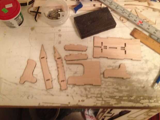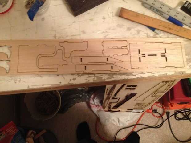 corté las piezas con un cortador del laser Epilog 60 vatios en Techshop.  La configuración que uso para 1/8" balsa es 35 velocidad, potencia 40, frecuencia de 500hz.  Esto parece hacer la balsa limpiar a través sin excesiva charing.