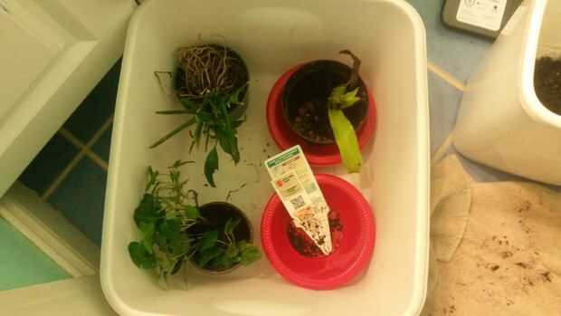 La primera cosa a hacer es lavar el suelo de las raíces de las plantas. Quitando el suelo también elimina el riesgo de las malas hierbas y disminuye el riesgo de plagas. Lo que hice fue utilizar mis manos para quitar tanto del suelo como pude, y luego lavar el resto con agua.