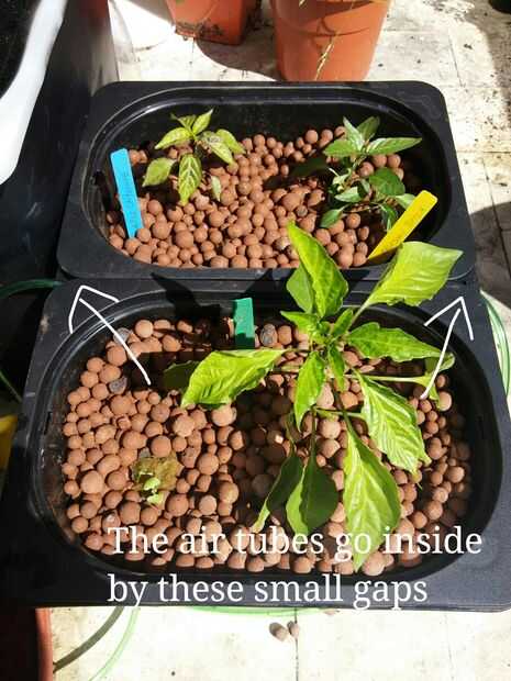 Darles oxígeno mediante la adición de la bomba de aire (estoy usando una bomba con 2 formas de aire) y airstones. Los compartimientos superior apenas toque el agua, la idea es que las raíces "persiguen" el agua y crecen con el nivel del agua baja lentamente. En principio es importante comprobar si la arcilla expandida toca el agua para que las plantas no mueren en usted. La arcilla expandida actúa como una esponja y se sorprendió al ver que a pesar de que sus contenedores principales apenas tocan el agua, las bolas de arcilla superior un poco húmedas. He añadido un contador de tiempo para que la bomba shutts apagado de vez en cuando pero cuando las raíces Obten sumergidas en la solución hidropónica que será probablemente eludir el temporizador para que las raíces Obtén oxígeno 24/7.